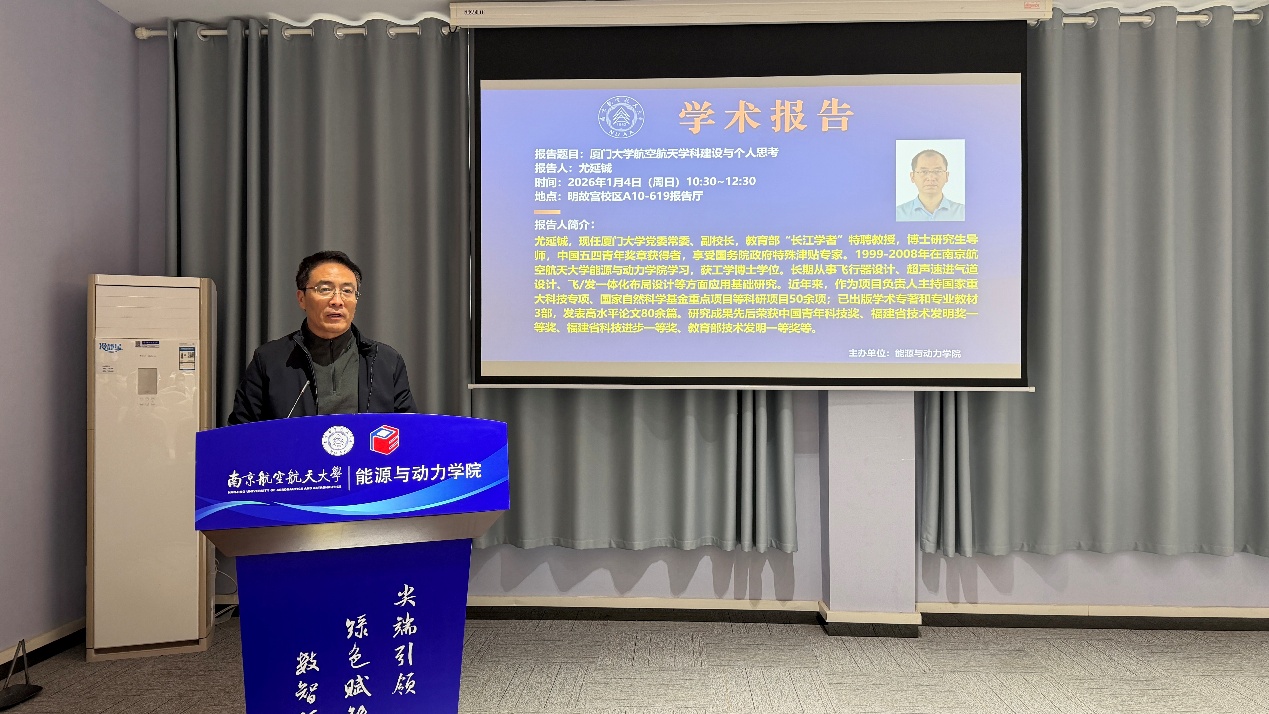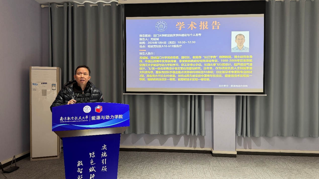 1月4日,厦门大学党委常委、副校长尤延铖教授应邀到访学院,作题为“厦门大学航空航天学科建设与个人思考”的专题报告。副校长崔海涛,学院院长谭慧俊、副院长张悦,以及学院师生代表100余人参加报告会。报告会由谭慧俊主持。