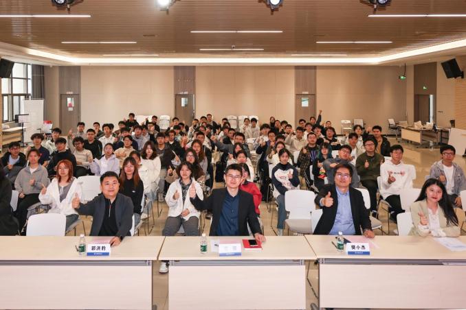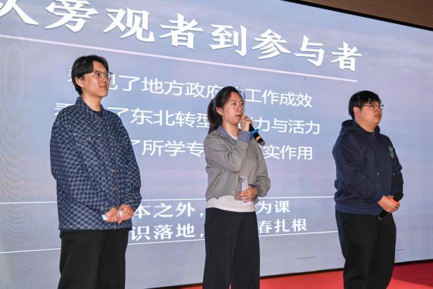 学院“源动新生”实践团代表以《书本之外,大地为课:我们的寒假实践之旅》为题,分享了团队成员在寒假奔赴沈阳、阜新、鞍山、长春等地,寻访东北能源转型的故事。辅导员王祎鹏与四位本科生代表带来《这些书打动我》集体分享,同学们在书摘金句中感受成长的力量。