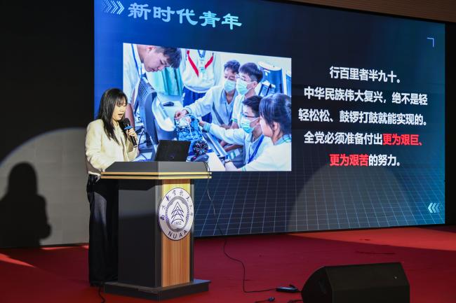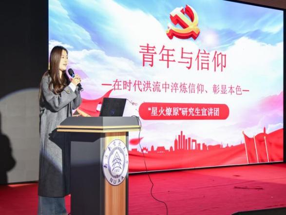马克思主义学院星火燎原研究生理论宣讲团成员曹思淼、王丹带来主题宣讲,从赵淳生院士“两个都要”的初心坚守到马克思“青年之问与时代之责”的深刻探讨,诠释了科技报国的赤诚担当与理想信念的领航力量。