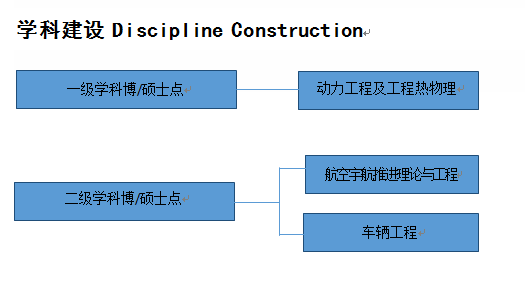 学院设有动力工程及工程热物理一级学科博士点(含4个二级学科博士点),航空宇航推进理论与工程和车辆工程2个二级学科博士点;动力工程及工程热物理一级学科硕士点(含4个二级学科硕士点)和航空宇航推进理论与工程、车辆工程2个二级学科硕士点;建有航空工程、动力工程和车辆工程等3个工程硕士点;建有飞行器动力工程、能源与动力工程、车辆工程等3个本科专业。此外,建有“动力工程及工程热物理”博士后流动站;与兄弟学院共建有航空宇航科学与技术、机械工程、力学、交通运输与工程等4个博士后流动站。